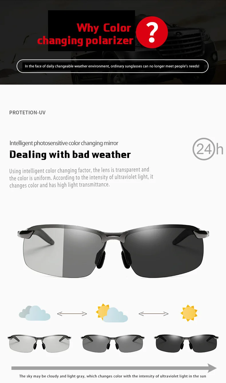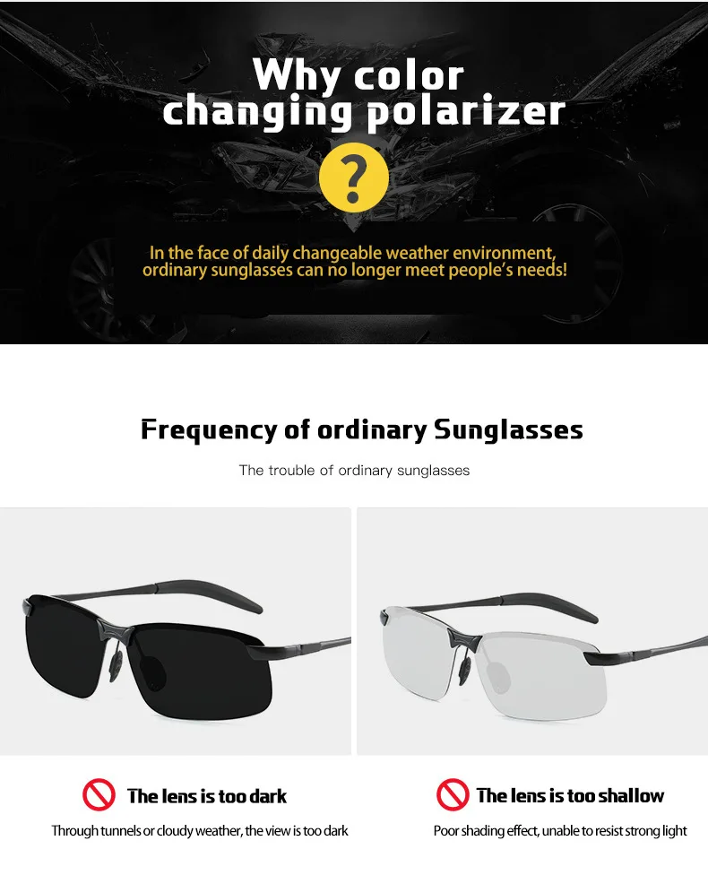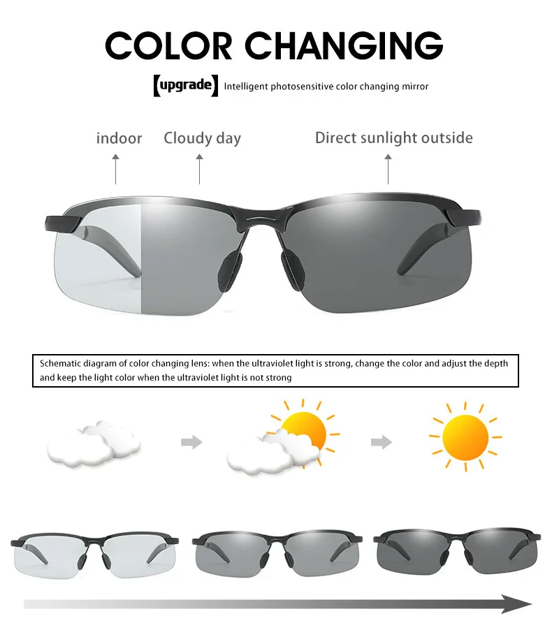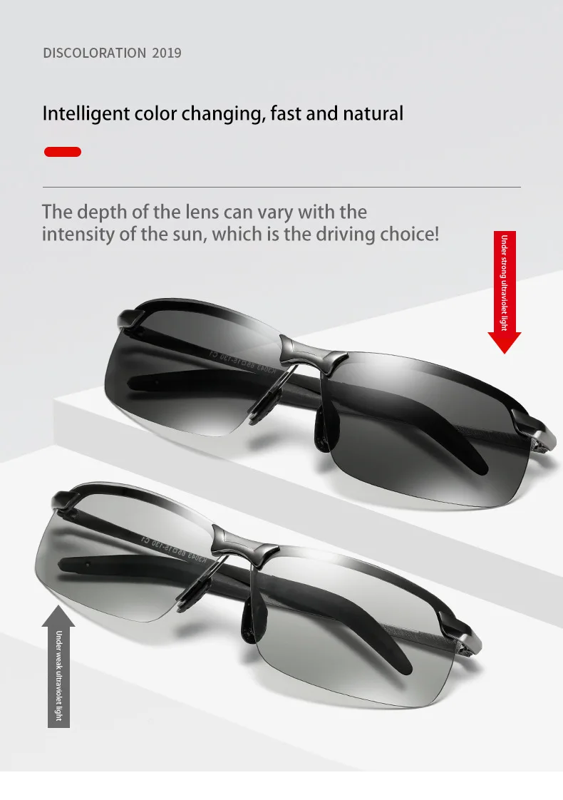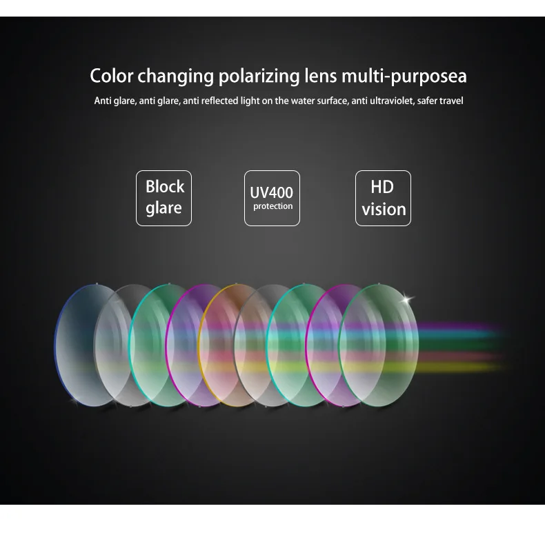 • Color Changing Lenses :Experience the magic of color change with these sunglasses. Designed with a unique optical attribute, they offer a stunning transformation from day to night, making them perfect both day and night driving.