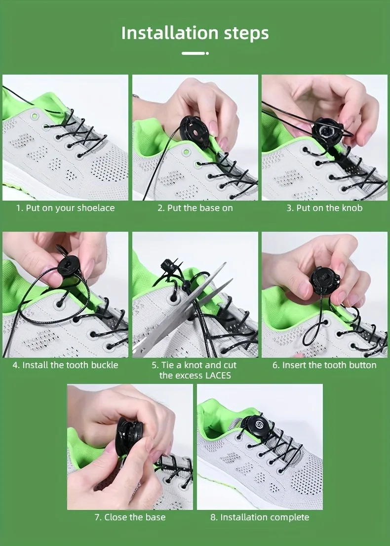 1.Quick to put on and take off: the swivel buckle shoelace adopts innovative tying and untying technology, which allows you to get rid of the tedious shoelace tying steps and easily put on and take off your shoes, especially suitable children, seniors and athletes, etc.